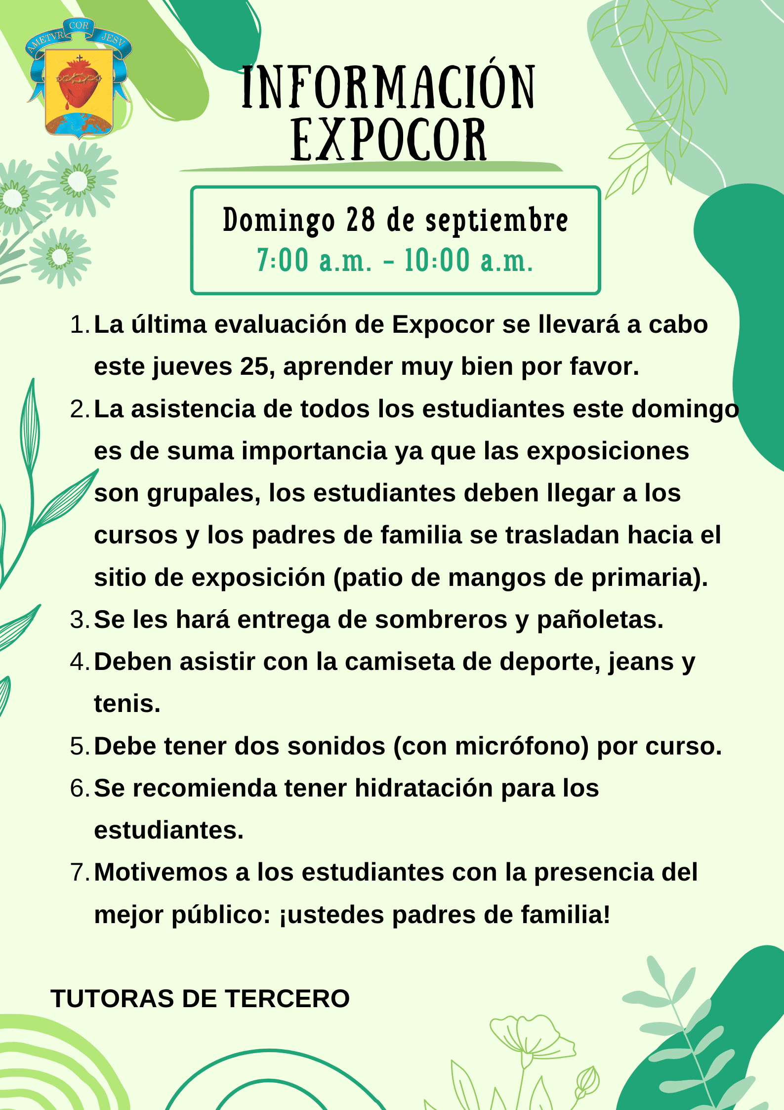 - Recuerdo que el domingo 28 es nuestro evento Expocor, la asistencia de todos los estudiantes y de los padres de familia es de mucha impotancia, recibirán instrucciones para el evento el día lunes.